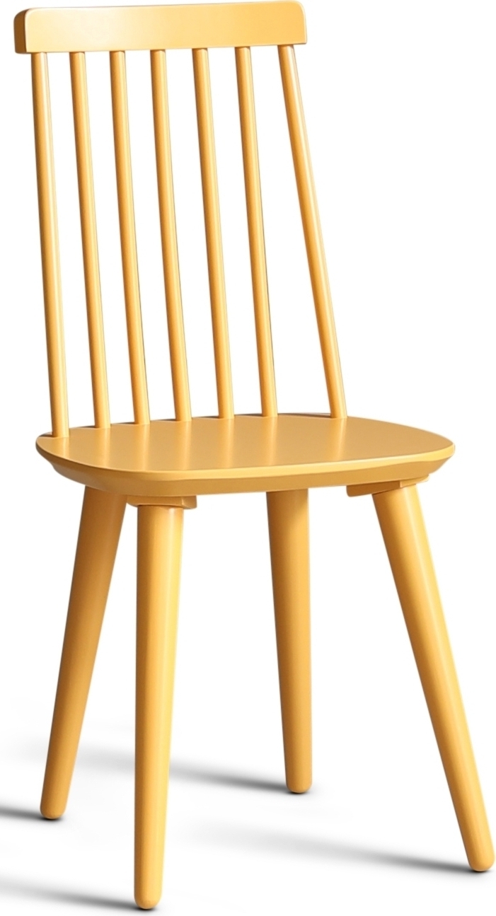 Dalsland matgrupp med runt matbord med toppskiva i oljad ek och vitlackat underrede. Dalsland pinnstolar i en läcker gul lack (RAL1032)